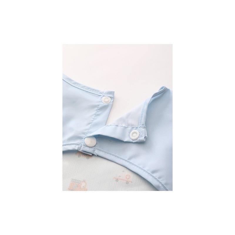 O babete com mangas é feito de poliéster com acabamento impermeável, uma camada que repele água e líquidos.