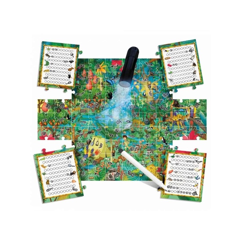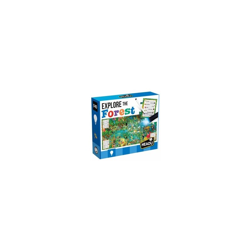 Puzzle Explore the Forest da Headu, após construíres o puzzle observa a ilustração com atenção e descobre todos os animais. Depois anota nos cartões de limpeza fácil as tuas descobertas, como se fosses um cientista! Graças à lanterna mágica também podes observar o que parece invisível a olho nú.