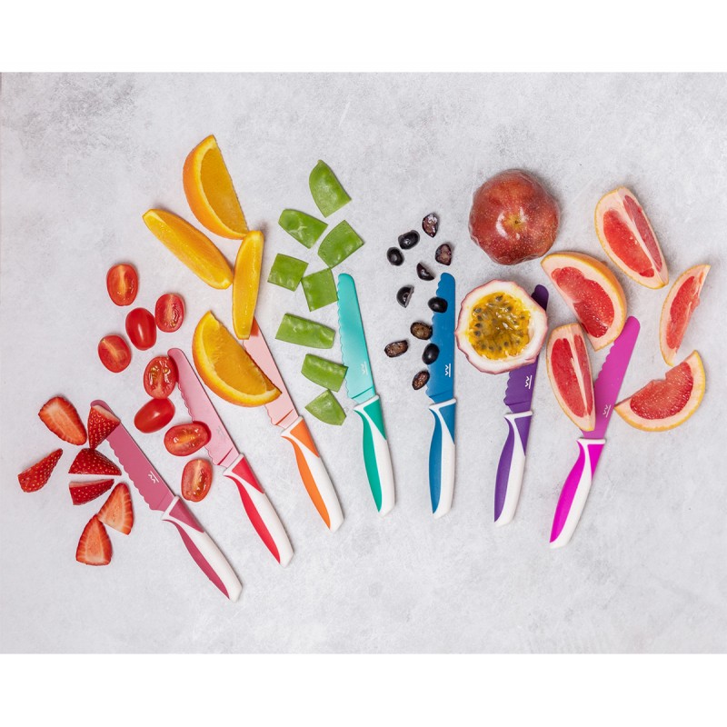 Faca infantil da Kiddkutter, facas projetadas para crianças a partir dos 3 anos, para que possam cortar os seus alimentos com segurança mas não vai cortar os seus dedinhos devido às serras arredondadas feitas de aço inoxidável. Uma maneira divertida e saudável para os pais ensinarem os seus filhos uma das habilidades mais importantes da vida: cozinhar.