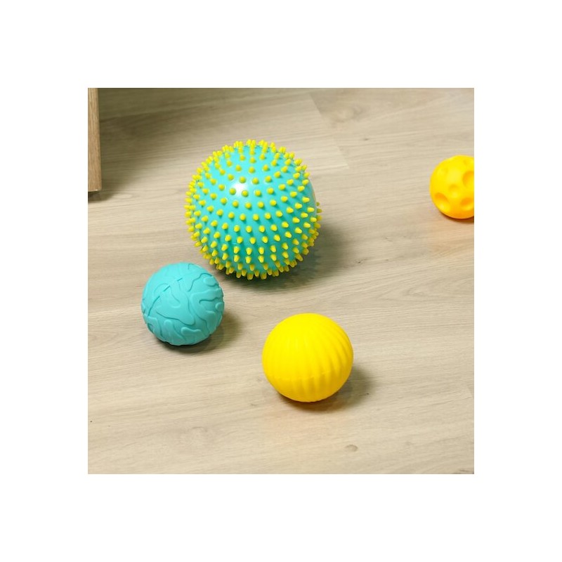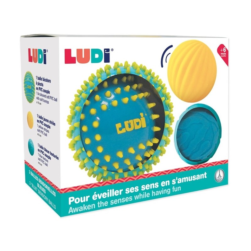 Conjunto de 3 Bolas Sensoriais da Ludi, um conjunto para ajudar os mais pequenos a estimular o tato, bem como a destreza manual e coordenação mão/olho. Conjunto inclui 2 pequenas bolas nervuradas com toque aveludado para maior maciez e 1 bola maior bicolor com protuberâncias macias para massagens ou cócegas.
